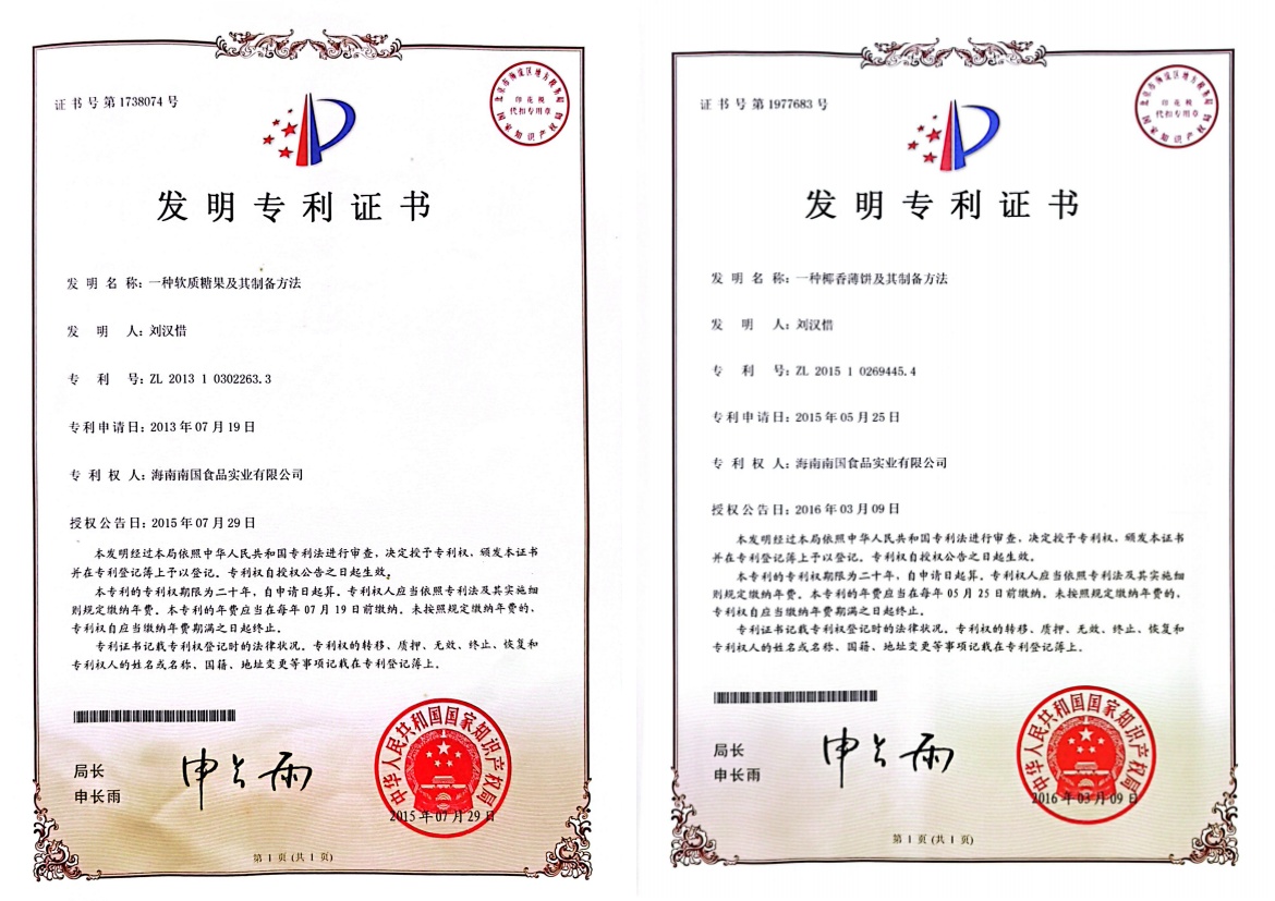 南国相继获得软质糖、椰香薄饼国家发明专利证书。